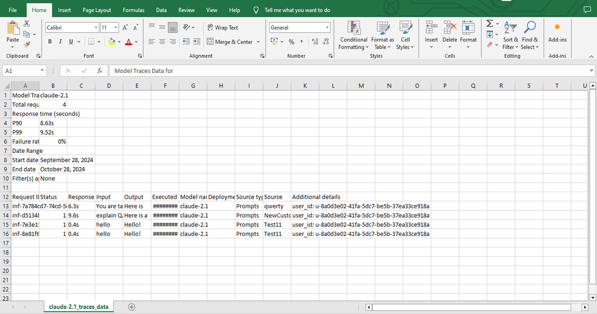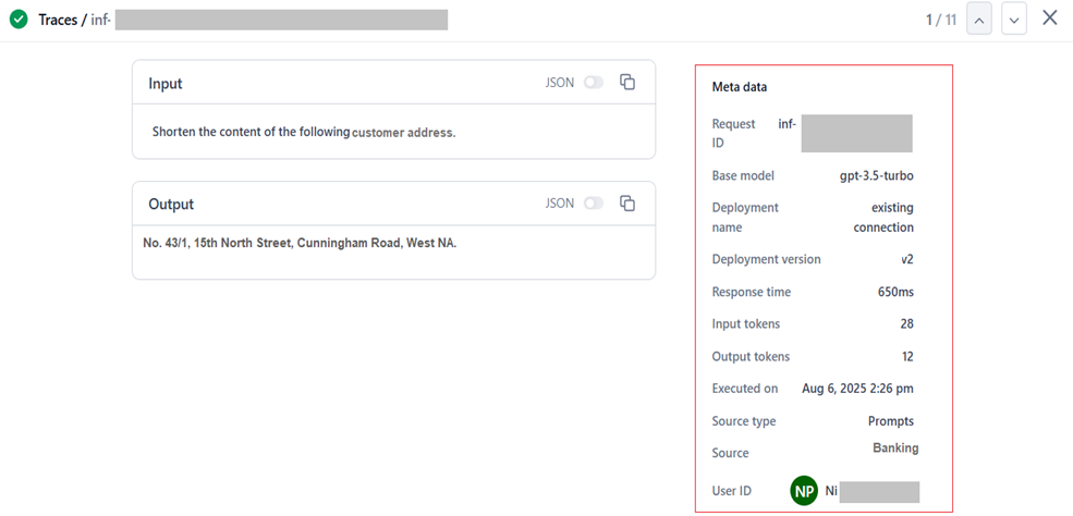 - Analyze the input for each request, the output generated by the model, the response time, and the source or module from which the request originated. This analysis supports performance insights, error diagnosis, source identification, and optimization of usage and user experience.