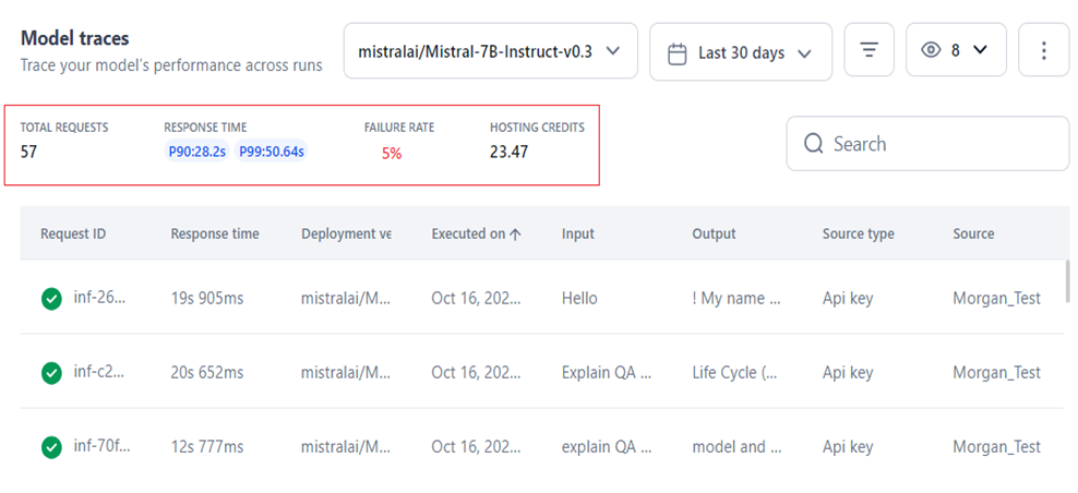 Model Traces offers a centralized view of run-level insights for the selected model deployed in your account. It displays information across multiple deployments. For open-source and fine-tuned models, you can filter data by deployment name, while for external models, data is shown based on the connection name.