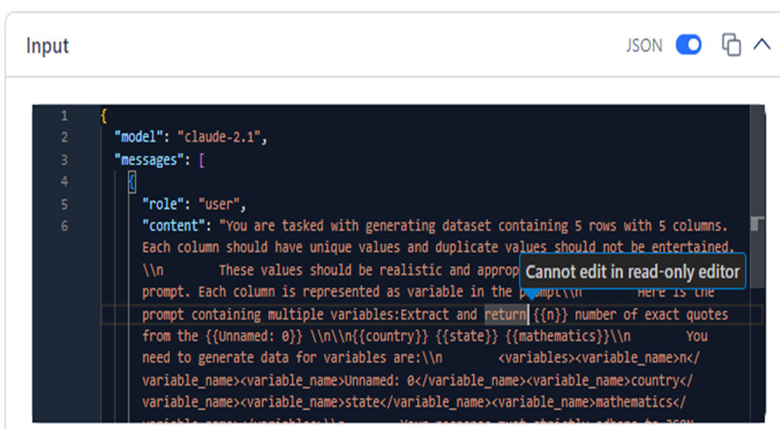 Enabling JSON mode allows you to access the JSON view of the input in the editor. This view provides the complete response/request payload sent to the model, including additional keys and details not visible in plain text format.