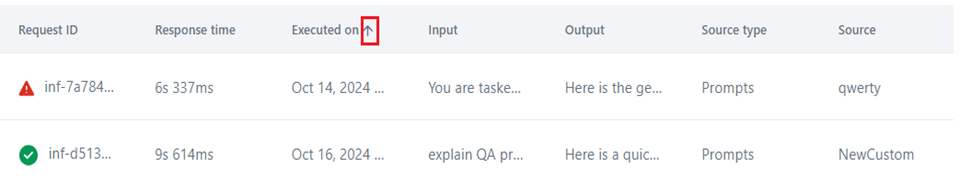 Click the Sort filter in the Executed on column to view the data in ascending or descending order by execution date.