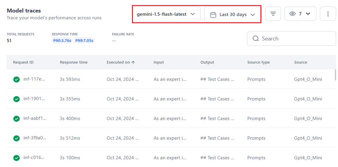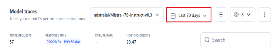 Use the time selection filter to view and monitor model traces across runs within a specific period. This allows you to focus on requests within a set time-frame to track changes or perform targeted debugging.