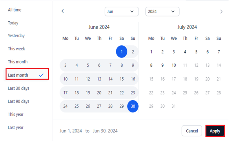 - Last 30 Days: Displays data for the past 30 days from the current date.