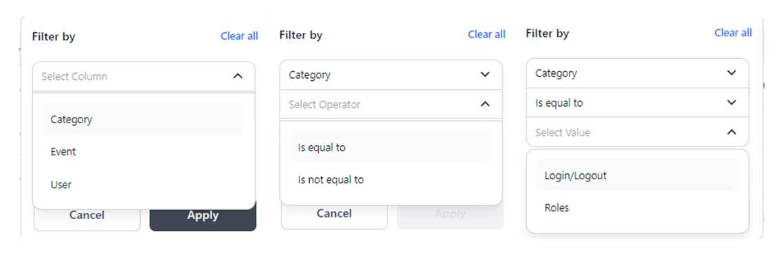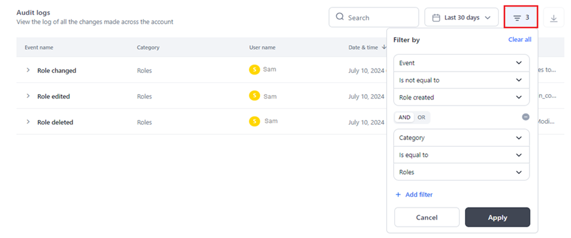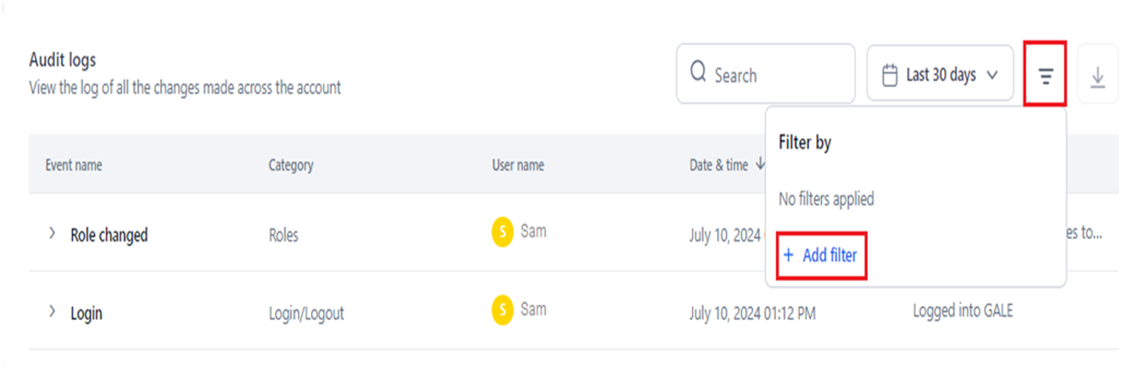 You can enhance your audit log visibility by adding multiple filters. This capability allows you to specify detailed criteria such as specific categories, events, or users, enabling you to obtain fine-grained results.
