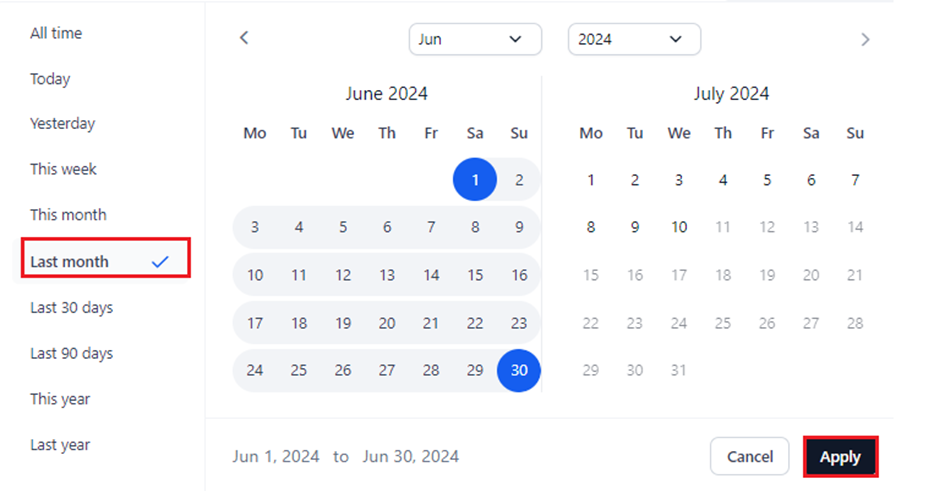 The time range is automatically selected on the calendar widget once you select the period. Also, the date range is displayed at the bottom of the widget.