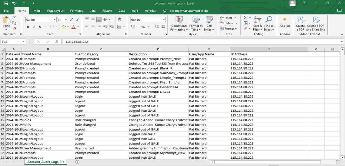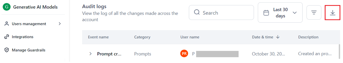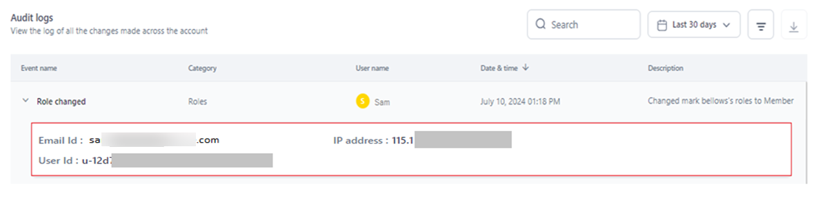 The Export feature helps prepare and export account-level audit logs into a .csv file. The audit logs data for the following columns is downloaded. Learn more.