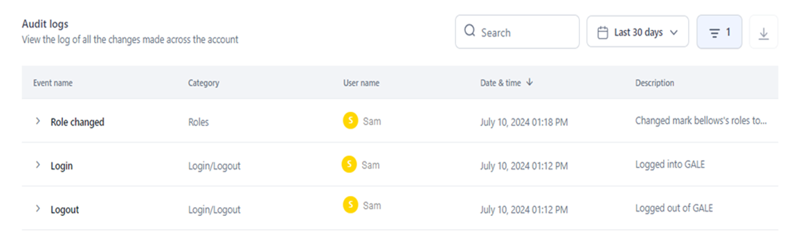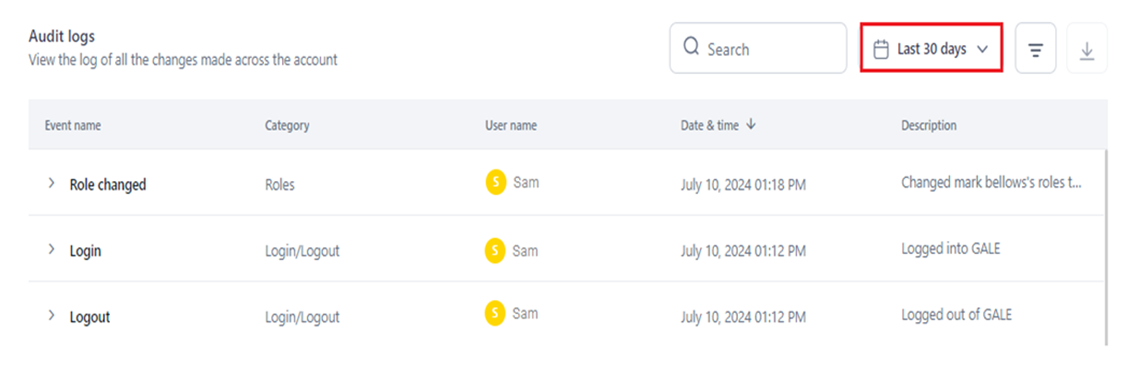 - Last 30 Days: Displays logs for the past 30 days from the current date, if events’ data exists.
