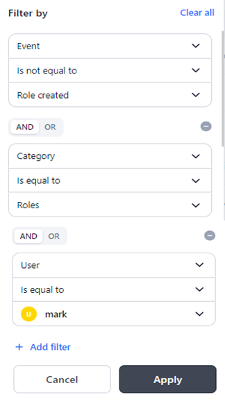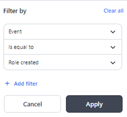 For example, applying the filter Event Is Equal To Role Created, as shown below, displays only the logs for the role creation event.