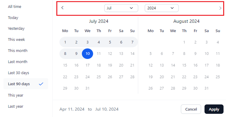 Select the required period on the left panel, or select a specific date, month or year on the calendar widget (the current day is the default selection).