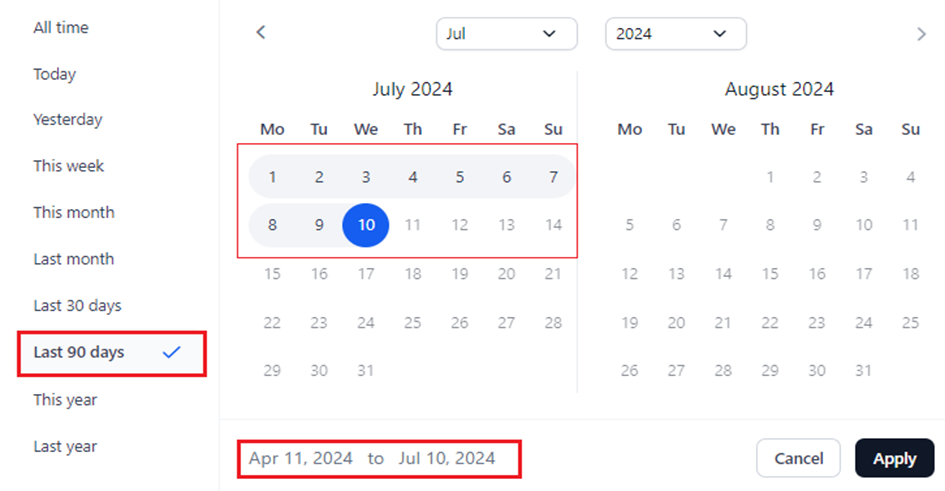 - Last 90 Days: Displays logs for the past 90 days from the current date.