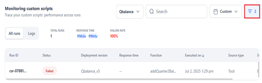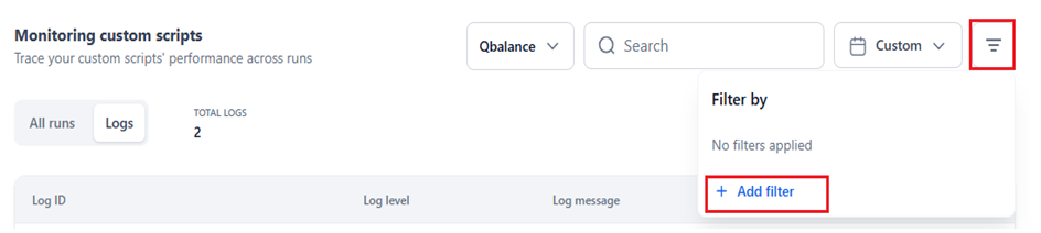 You can narrow down the information displayed for custom script runs and logs by applying custom column filters. This functionality is similar to the Filter in the Audit Logs feature. Learn more.