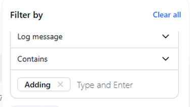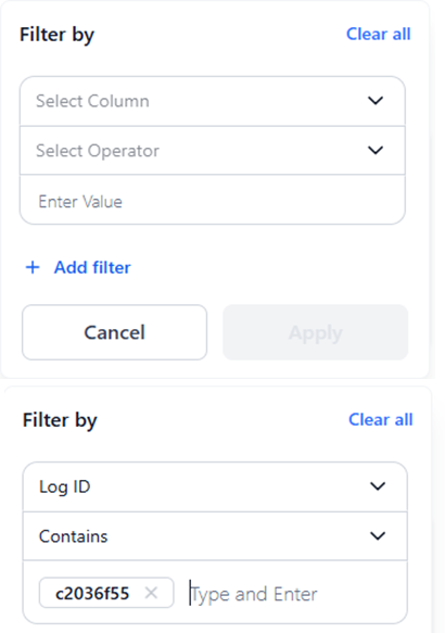 - In the Logs section, all column fields except Timestamp can be used as filters.