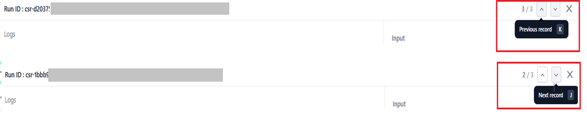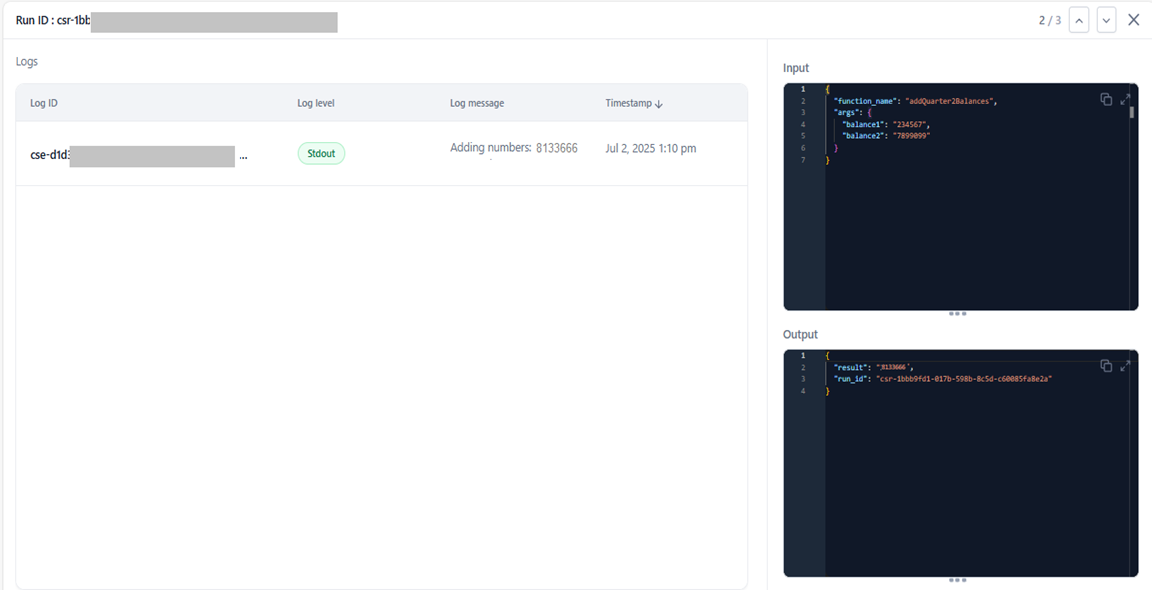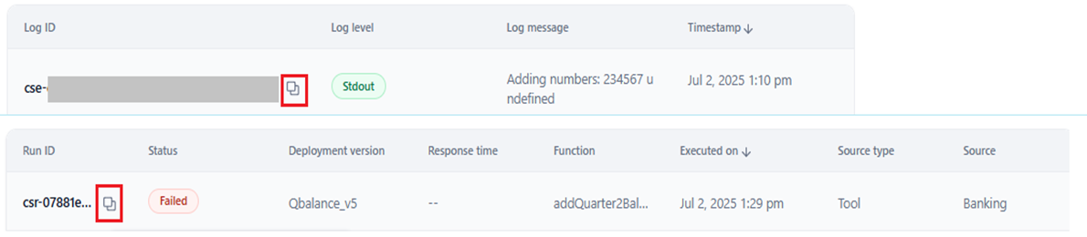 ID Copying: Click the copy icon when hovering over Run ID or Log ID.