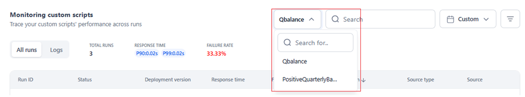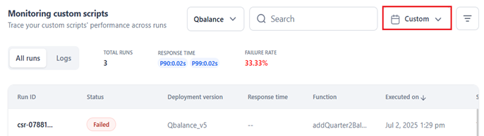 Use the time selection dropdown (displayed as "Custom") at the top-right of the page to view and monitor script runs/logs within a specific past period or the current day. This allows you to focus on specific runs to track changes or perform targeted debugging.