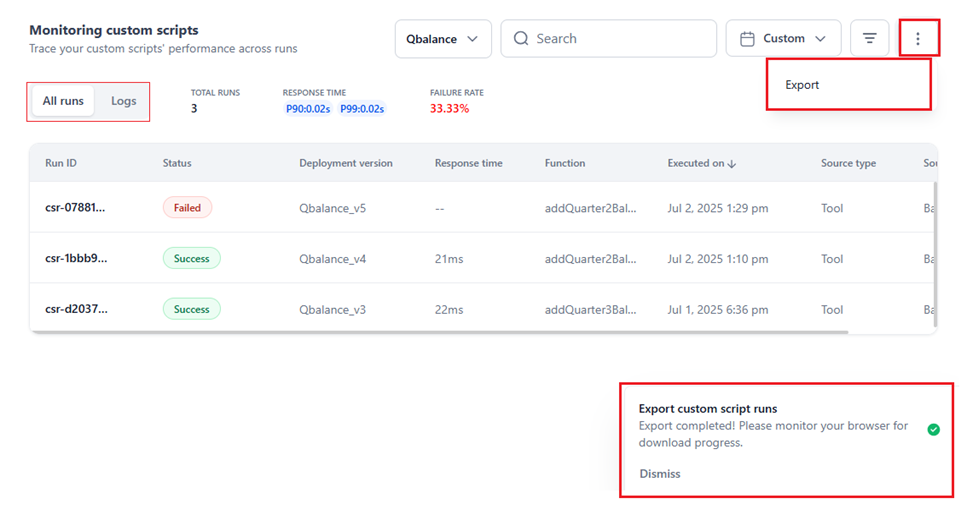 Exporting All Runs and Logs data for the selected custom script downloads a .csv file in the configured schema, reflecting the selected date range and applied column filters. To export the dataset, follow the steps below: