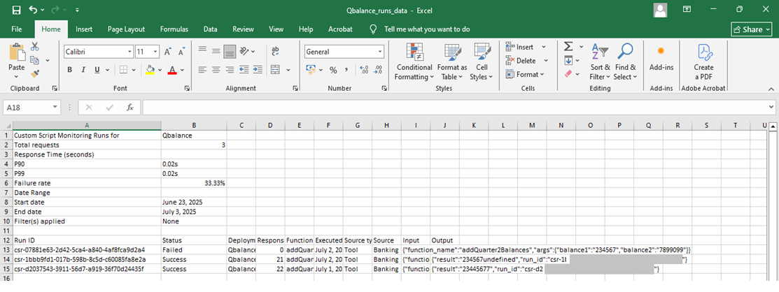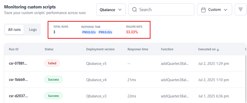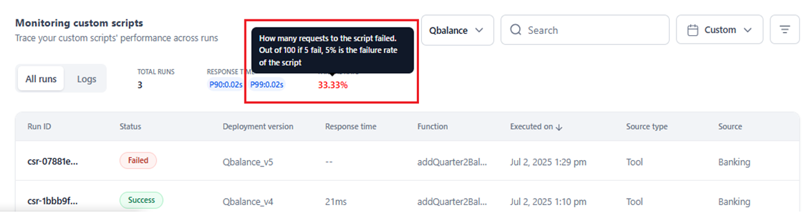 Failure Rate: Indicates the number of script runs that failed with an error code out of the total runs executed since deployment. For example, 1 failure in 3 runs = 33.33%.