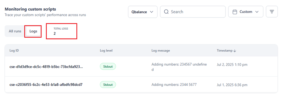 print()in Python orconsole.log()in JavaScript), logs appear in the Logs section only after the script execution completes (success or failure). - Custom logging with the