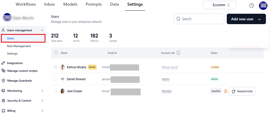 | Users Management | Helps add, remove, and manage admin, member, and viewer users, roles, and permissions for accounts, workflows, and models. Manage user settings for AD sync, profile visibility and configuration, and email notifications to users. |
