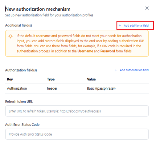 - (Optional) Click + Add Additional Field to add additional fields for authorization. See the Add Additional Field section.