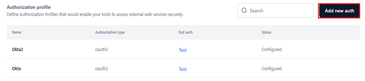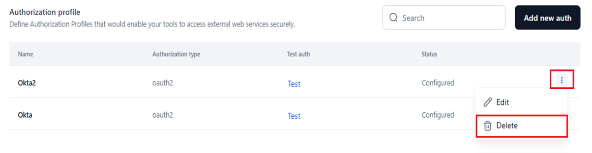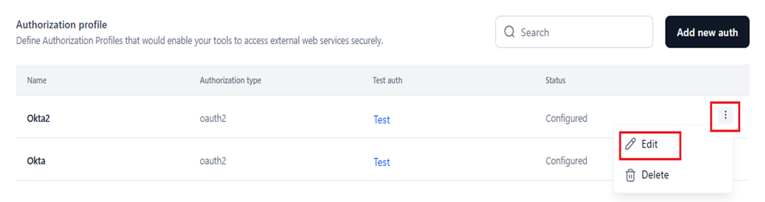 - Test auth: Click the Test button corresponding to a configured profile to check if it establishes a connection with an external service based on the configured profile.