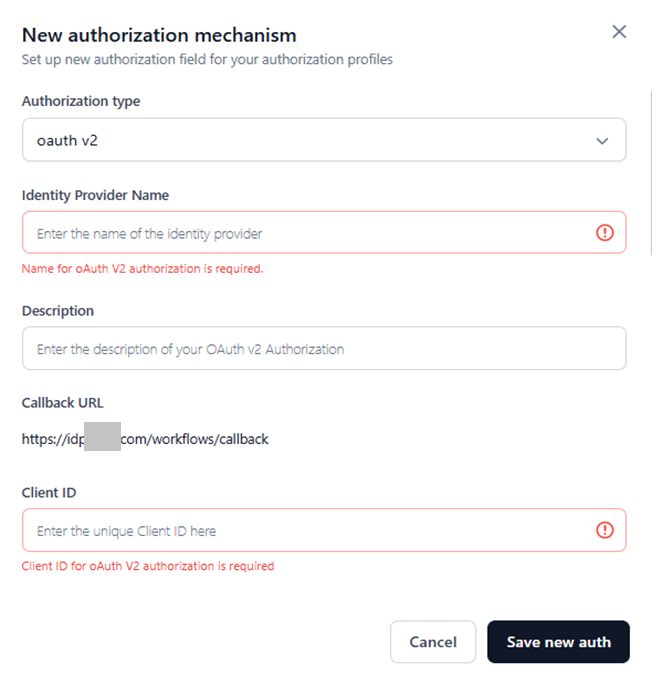 | Callback URL | The endpoint in an OAuth 2.0 flow where the authorization server redirects the user after they grant or deny permission. It is used to return the authorization code or access token to the client application. The default URL is provided in the form. | Required | OAuth V2 and OAuth v2 Client Credential |