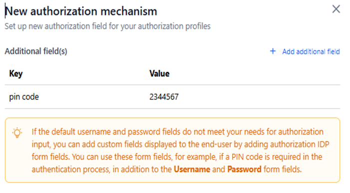 If the default Username and Password fields do not meet your authorization requirements, you can add custom fields using additional fields or authorization IDP form fields to the authorization process. For example, if a PIN code is required in addition to the standard login fields, you can include it as an extra input for the end user.