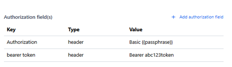 Click + Add Authorization Field in the New Authorization Mechanism window and enter one or more key/value pairs.