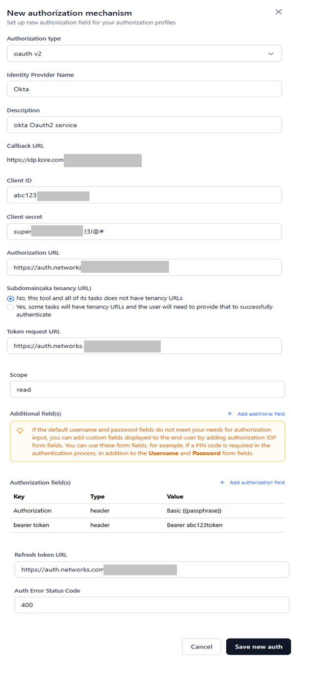Except for Scope, Description, Refresh Token URL, Additional fields, Authorization fields, and Auth Error Status Code, all the fields are mandatory.