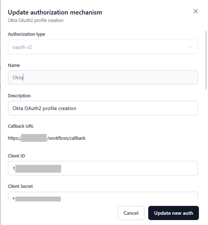Modify the required fields in the Update authorization mechanism window.