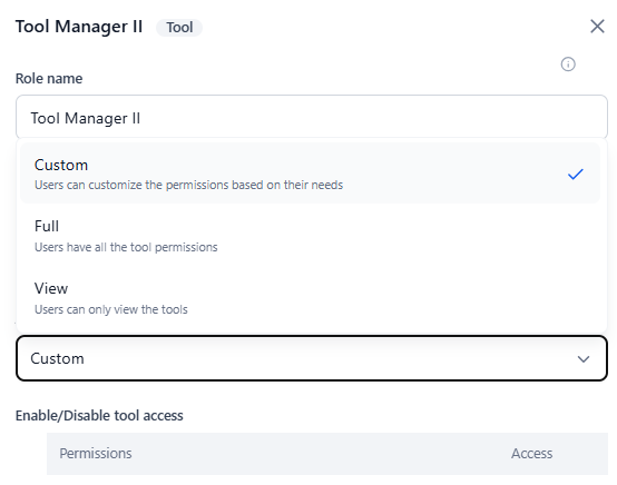 - Access: Select either Custom, Full, or View.