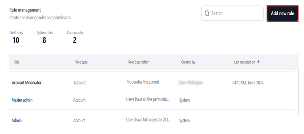 As the Master Admin, you have the highest level of access, allowing you to create, modify, and delete permissions for custom roles and manage users in your account.