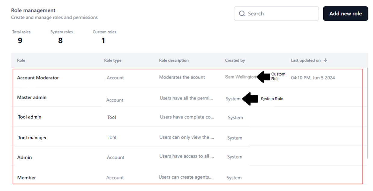 Also called Default roles, these are inbuilt in the system at the agentic app, account and workflow levels defined in the system. The scopes, permissions, and access levels for these roles are preset based on what users commonly require and cannot be modified in the application. Also, system roles cannot be deleted.