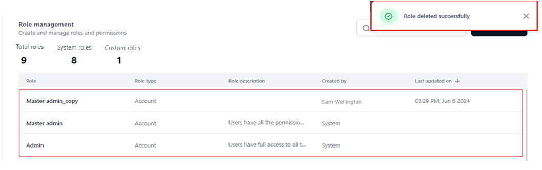The role is deleted successfully from the Role Management dashboard and the count for custom roles is updated (decreased).