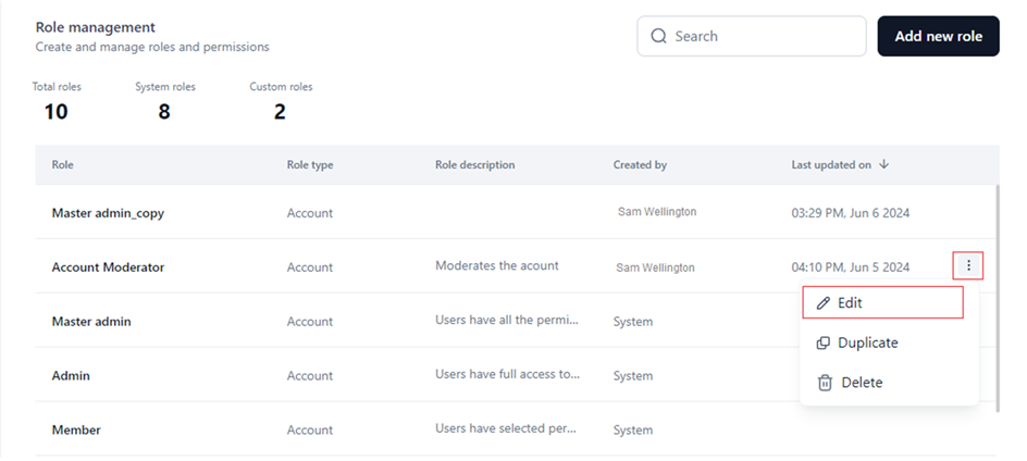- Click the Ellipses icon for the custom role you want to modify.