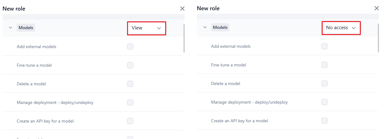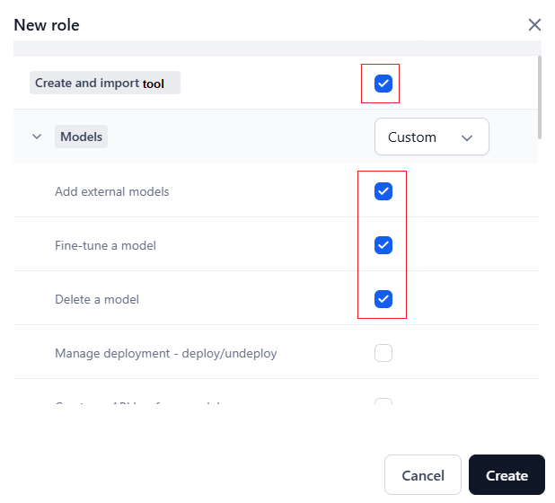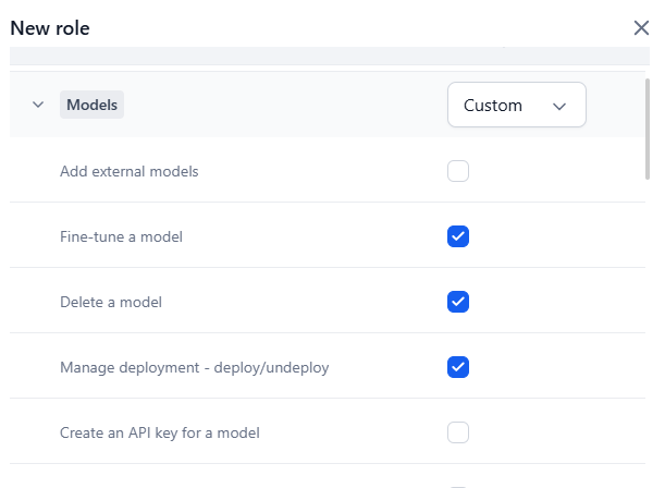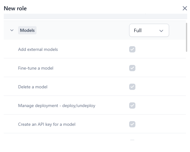 | Admin | Users have access to all the permissions except model deletion, billing, and connectors. |