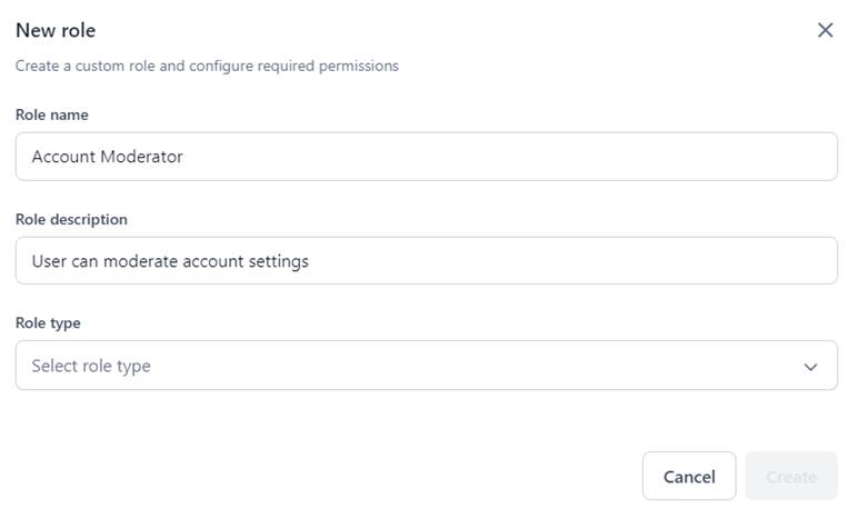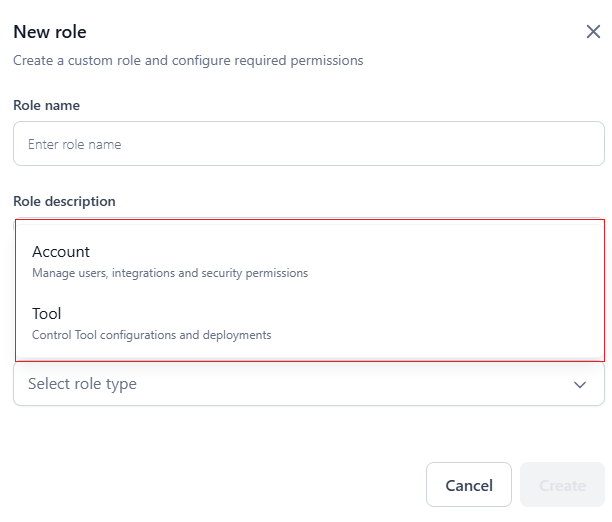 - Account: Users invited to the account must be assigned an Account role (default or custom). The role type manages access to users, integrations, and security permissions.