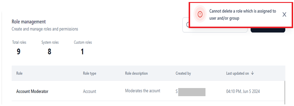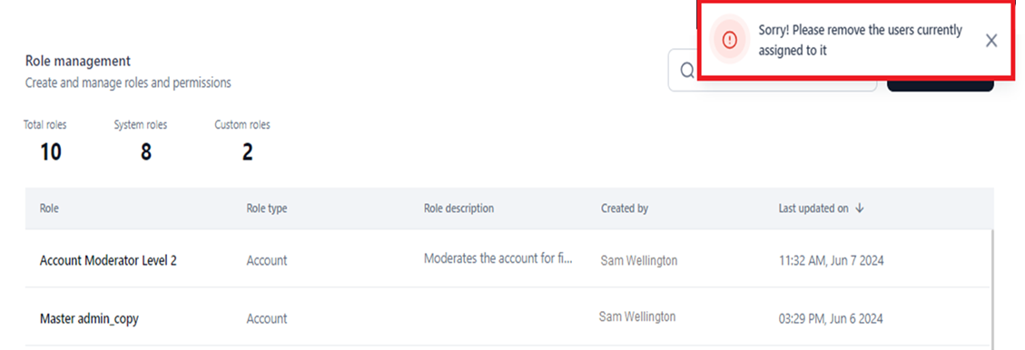 The Settings console allows you to delete only unassigned roles. If a role is assigned to active/inactive users during deletion, the following error message is displayed.