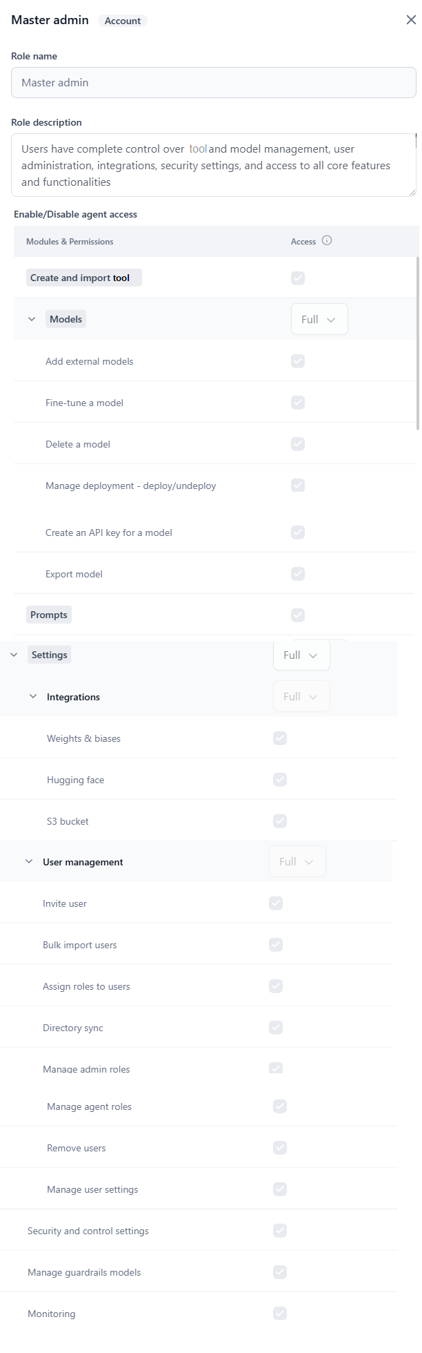 | Master Admin | Users have complete control over workflow and model management, and access to all the core features and functionalities of the Settings console. |
