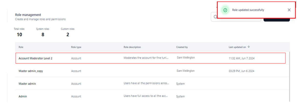 The new custom role is created and listed on the Role Management dashboard.