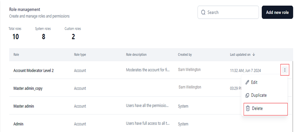 - Click the Ellipses icon for the custom role you want to delete.