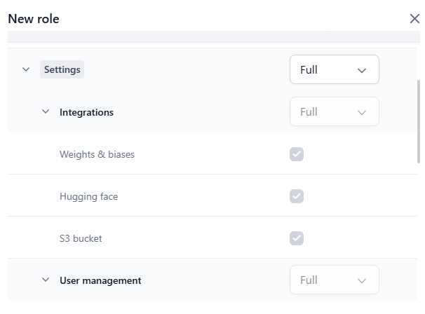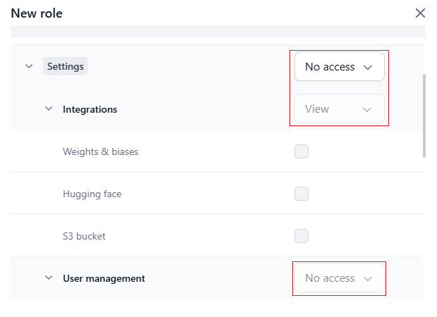 Select the access level for Models, Settings, Integrations, and User Management from the following options: