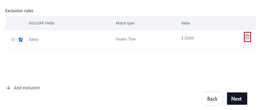 - (Optional) An Exclusion Rule includes the AD/LDAP field, Match Type, and Value. You must set Match Type for one of the following options:
