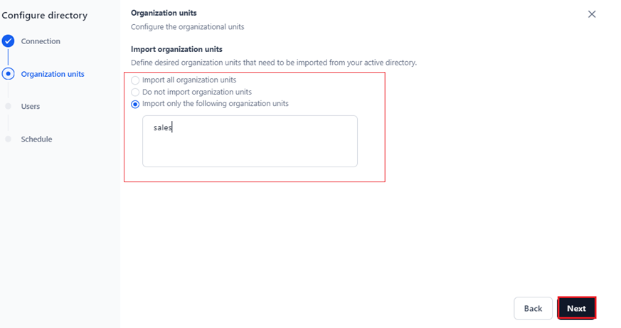 - Select and Import the Organizational Units (OUs): Choose specific OUs or all OUs from which to import key user information.
