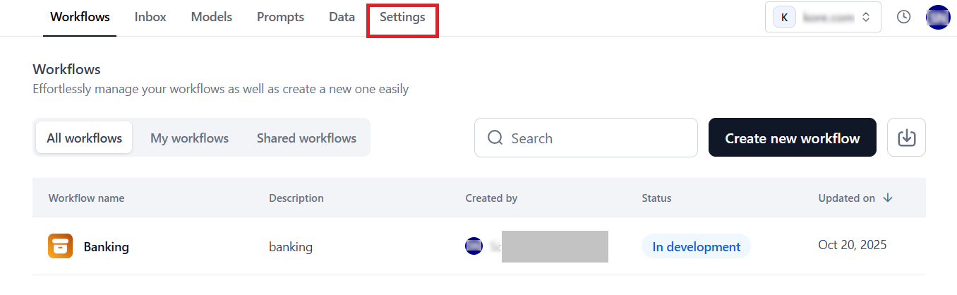 Log in → In AI for Process Modules top menu → Click Settings.