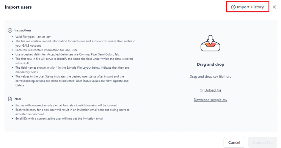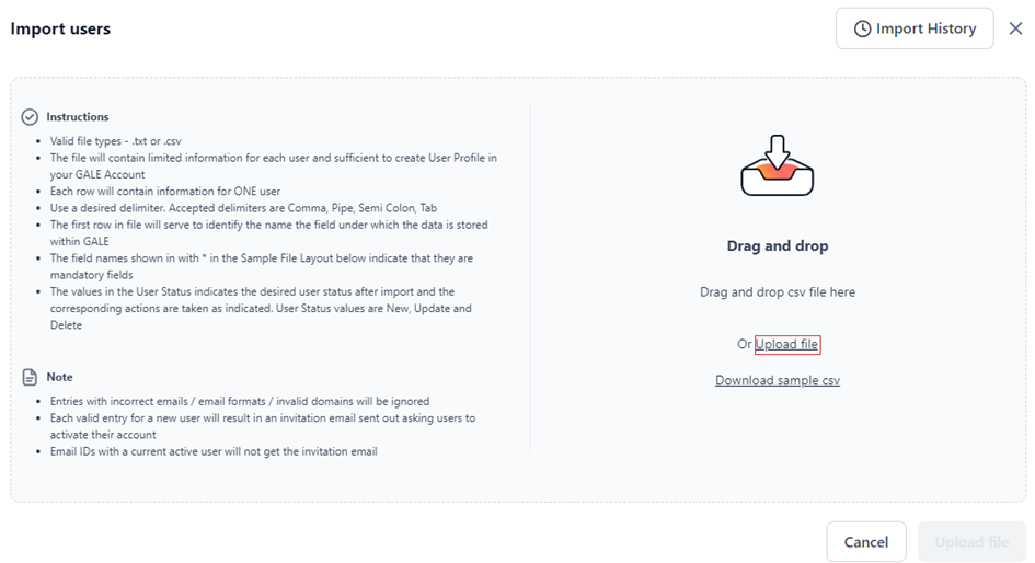 The import feature allows administrators to add multiple users at once using .txt or .csv files. To ensure compatibility, download the sample CSV file, add your user details to this file, and upload the file.