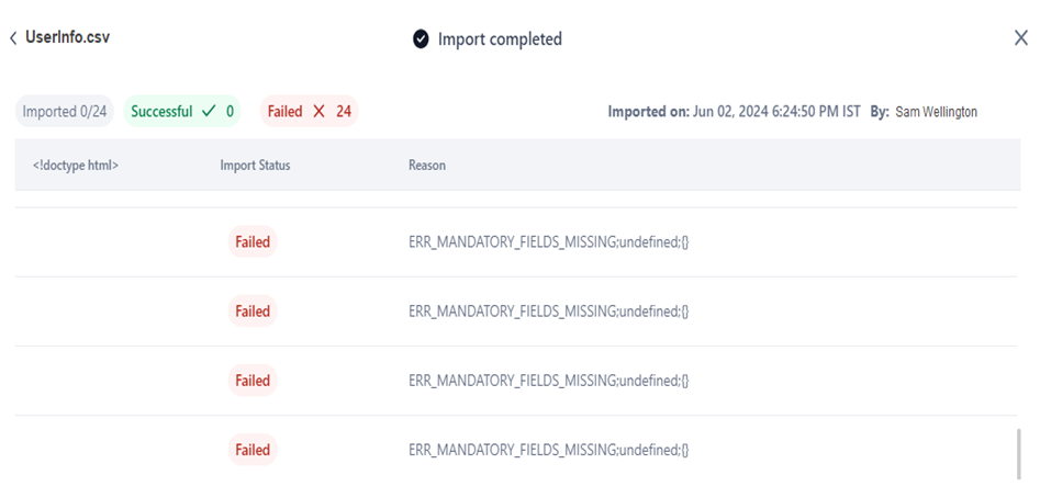 The system validates the file for errors. If the user data contains errors, a window is displayed showing the import status and the reason for the errors.