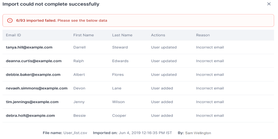 You can identify which user data failed to import, review the actions completed by the user, and understand the reason for the failure.