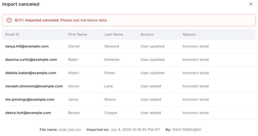 The system cancels the import for data that fails due to validation errors, such as an incorrect email address. A window is displayed showing the import status and reason after the import is canceled.