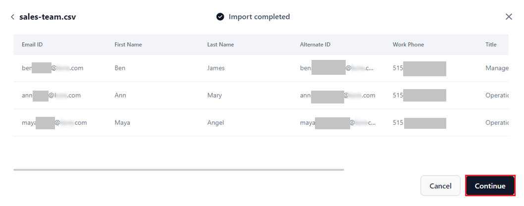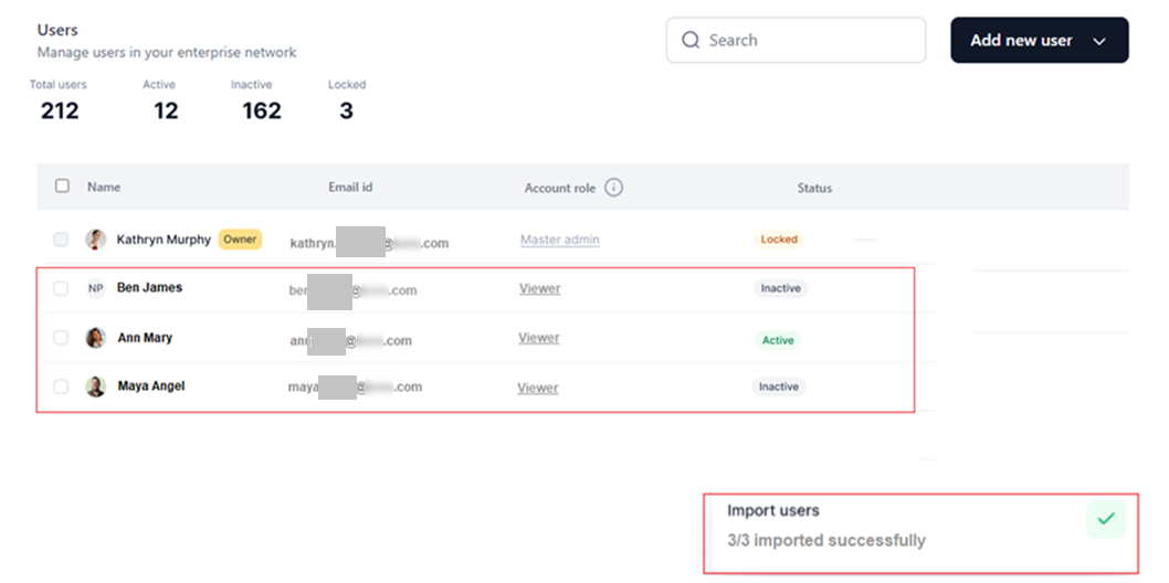 - Entries with invalid email formats, missing domain name, or wrong email IDs are ignored during import.