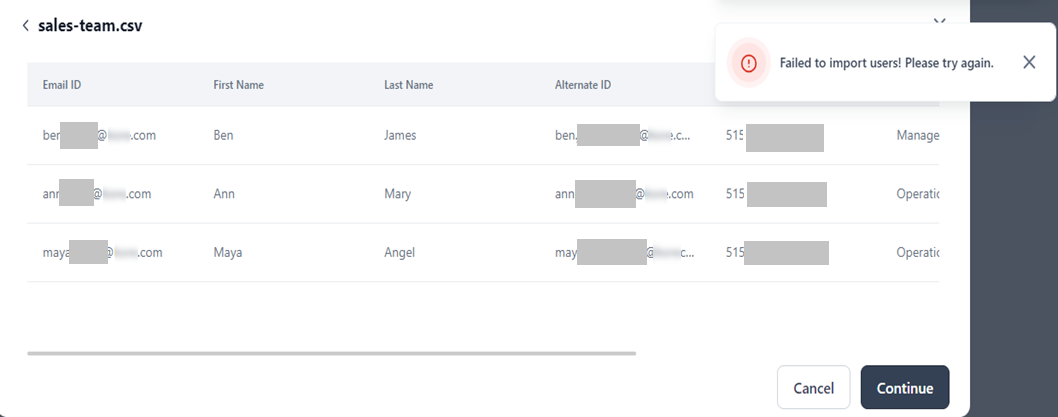 Once you know the cause, you can retry importing the corrected user data.