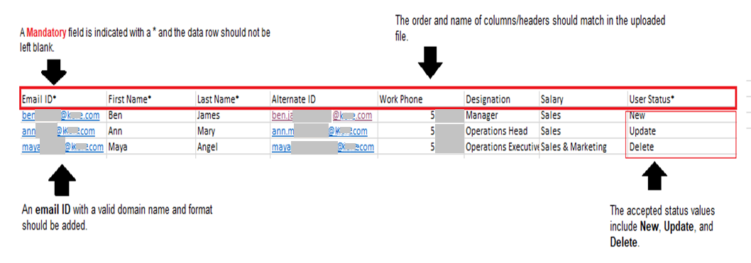 - The file must contain the required user information, such as name, email ID, and status, to create a user profile in your AI for Process account.